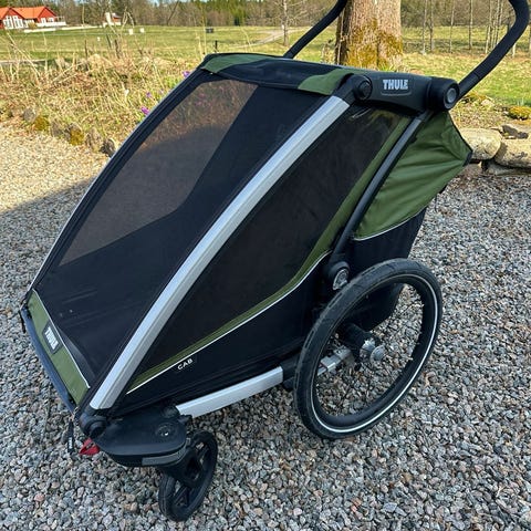 Thule Cheetah xt2 multisportvagn för två barn, vilken kan användas som både cykelvagn och barnvagn. Smidig och lätt att hantera, köra och cykla med. Sparsamt använd och i fint skick, med lite brukssmutsfläckar och en liten reva på fönsterplasten som enda ”skavanker” (se bild).