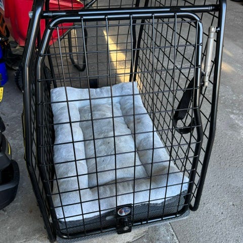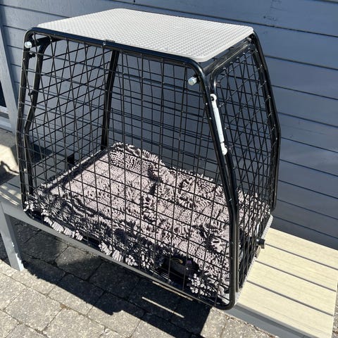 Hundbur i svart metall med en lite ”sned” sida (vänster). Har galler runtom, öppningsbar dörr fram och stadig bottenplatta. Går att låsa och båda nycklarna finns. Har använts i en Toyota Verso till en Labrador.