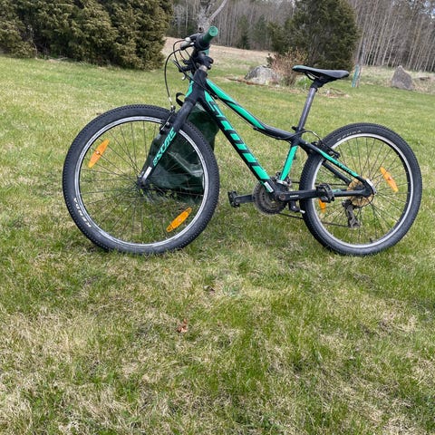 Juniorcykel, 7 växlar, skivbroms fram och bak. Växlar och bromsar fungerar. Men behov renovering: byte av grepp på handbroms, handtag, punktering fram, eventuellt byte av däck.