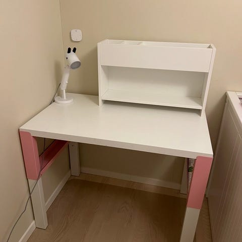 Vitt skrivbord från IKEA med en praktisk låda under skivan. Passar bra i barnrummet som plats för läxor eller pyssel.