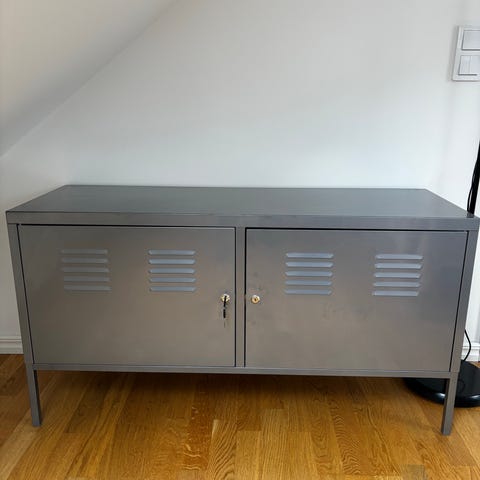 Lågt skåp i metall som kan användas som bl.a. TV möbel
