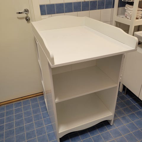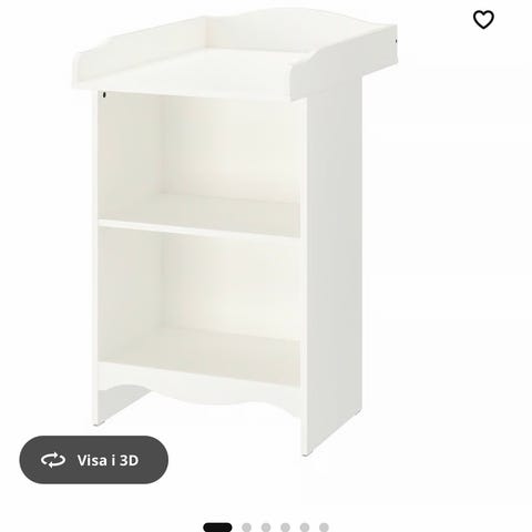 Skötbord från IKEA i vitt med två öppna hyllplan under. Ovansidan har en skötbädd med upphöjda kanter runt om. Skötbädd ingår, det går att ha fyra lådor fr IKEA, se bild, de på bilden ingår ej.