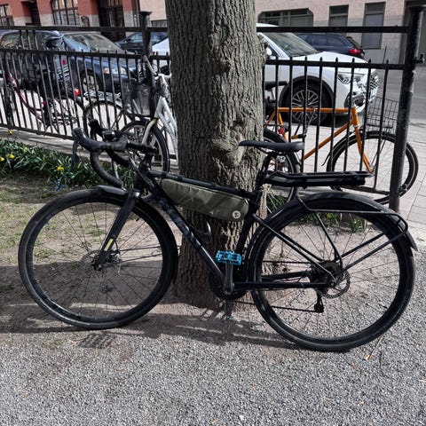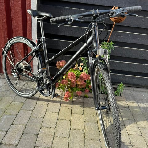 Bakhjulet är nytt — Bontrager IIR med något bredare gravel-däck och tan sidewall. Ny kassett. Gör cykeln mer tillgänglig och körbar i vardagen jämfört med ett smalt resdäck. Framhjulet har ett vanligt vägdäck. Båda axlarna är skruvade (snabb - insexnyckel lossande) istället för snabblossnande.