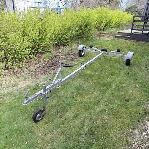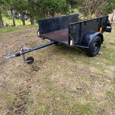 Rejäl vedkärra med dragstång och fyra stolpar Hemmabyggd av tidigare ägare. I okey skick