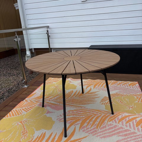 Runt soffbord från Beteak i trä med snyggt mönstrad skiva och svarta ben. FSC-märkt trä enligt lappen som hänger kvar på bordet.