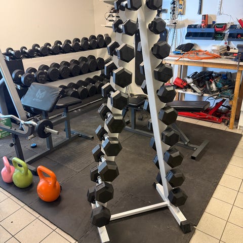 Sats med svarta hexagon-hantlar i olika vikter. Metallhandtag med greppvänlig yta.
