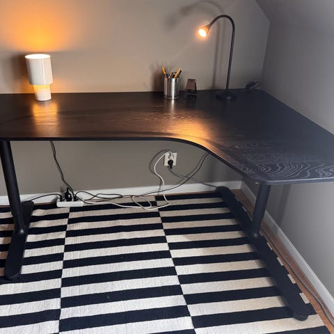 Ikea bekant skrivbord med utsvängt hör, utgått ur sortimentet med justerbara metall ben. Använt skick med någon repa i bordsbänken.