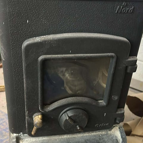 Svart gjutjärnskamin med dekorativ glasdörr framtill. Har toppanslutning för rökkanal och galler inuti.
