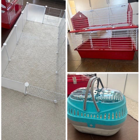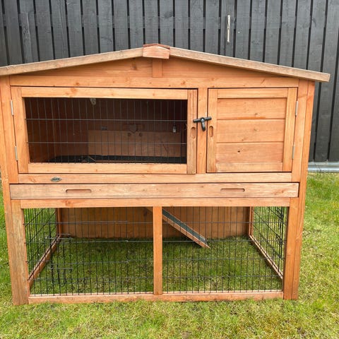 En Kerbl-hage som vi haft till kaniner, ca 220x103 cm, med nät i botten. Ena luckan saknas, men det har inte varit något problem för oss då vi haft hus mot öppningen – jag kan även se om jag har något galler att skicka med som går att fästa.