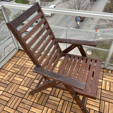 Två trädgårdsstolar i trä med ribbad sits och rygg. Båda har armstöd och går att fälla i ryggen.