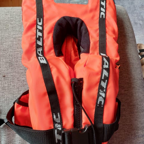 Orange barnflytväst från Baltic för vikt 15–30 kg. Har dragkedja fram, midjebälte med spänne och reflexdetaljer upptill.