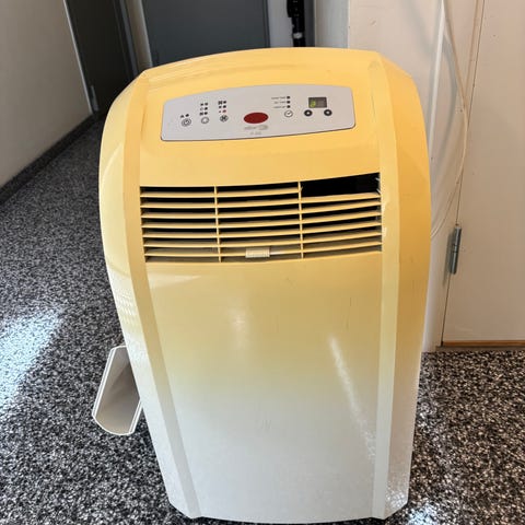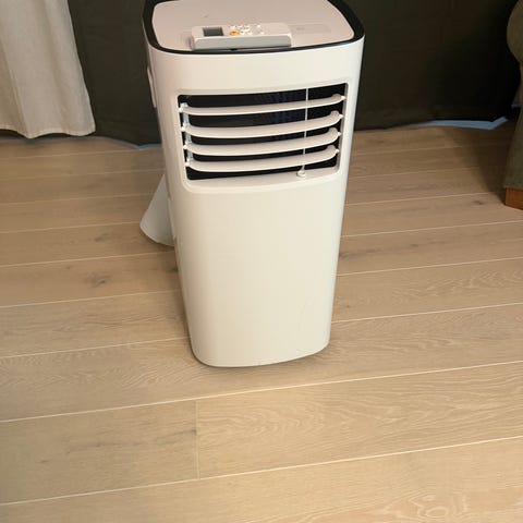 Portabel AC/luftkonditionering i beige och svart med bärhandtag upptill. Har ventilationsgaller på sidorna och kontrollpanel på ovansidan. Tillbehör ingår