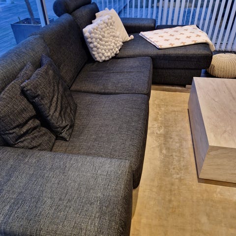2 sitsig Beige soffa med puff (95x60x47) i fint skick.