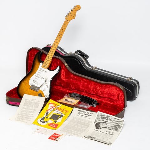 Hagström levererade under en period Fendergitarrer i svenska Järna-fodral. För att ha 60 år på nacken är skicket väldigt bra. Handtag, spännen och gångjärn är hela. Inga lagningar eller störande revor in/utvändigt. Åldersrelaterat slitage på läderskoningen.