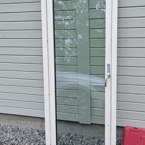 Vit glasdörr med karm och stort fönsterparti. Har handtag, lås och metallbeslag längs kanten. En nyckel.