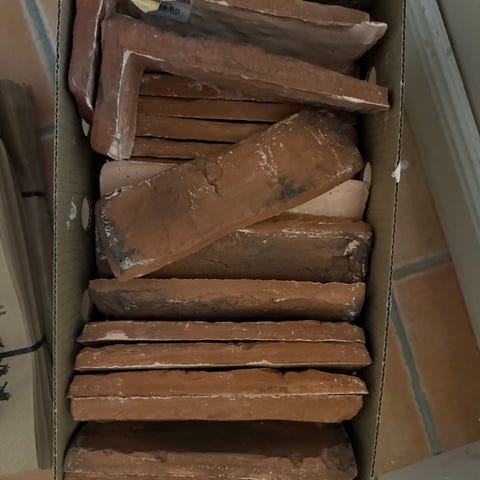 Röda tegelpannor till tak. Har täckt ett sommarhus på 65 kvm. Ligger staplade ute och redo att lastas på släp.
