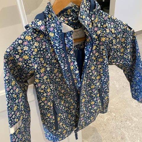 Blå skaljacka från Polarn O. Pyret i stl 122, unisexmodell i polyester. Jackan har dragkedja med skyddande vindslå, två fickor med dragkedja, avtagbar huva med resår och reflexdetaljer (WeatherPRO).