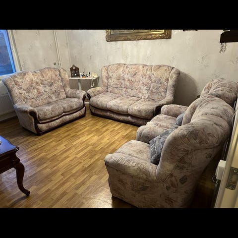 En soffgrupp med en soffa och två fåtöljer. Det är finsk design och möblerna är grå med röda linjer.
