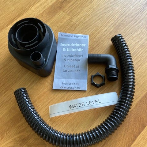 Rullar ut vid regn och är enkel att rulla in igen, med grön slang och svart anslutning.