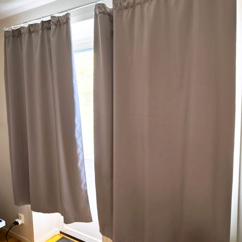 Mörkgrå gardiner från Jysk, tjockare tyg som hänger rakt. Har öljettöppning upptill för enkel upphängning på stång. Svart gardinstänger ingår