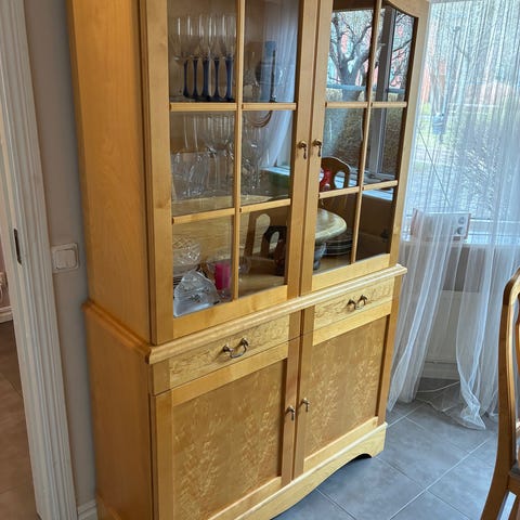 Vitrinskåp i furu med glasdörrar upptill och två trälådor i mitten. Underdel med dubbeldörrar och hyllplan som ger bra förvaring.