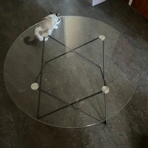Ett runt soffbord med en diameter på 90 cm i vit färg. Bordet har en enkel och funktionell design med ett rundat bordsskiva och metallben.
