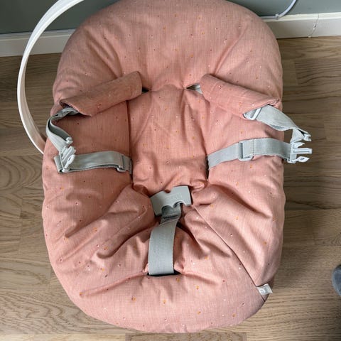 Kaos Klapp Newborn Set babysits i beige med sele och spänne framtill. Fästen undertill för att sätta den på Stokke-stol och mjuk stoppad sits för bebisen.