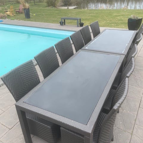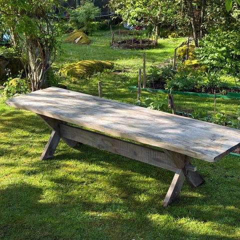 Stort utomhus matbord med grå plankstil i fint trä och svart underrede. Stadig konstruktion som gör att det står stabilt på gräsmattan eller altanen.