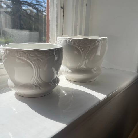 Denna vita keramikkruka med bladmönster är en klassisk modell känd som "Jenny", som producerades av både Steninge och Rörstrand under 1950-talet