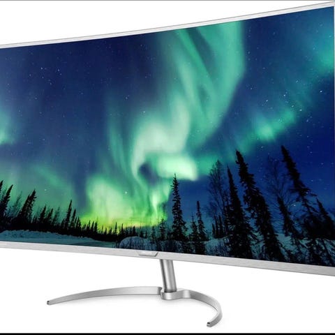 HP 34-tums böjd skärm i svart med smal kant och stabil fot. Har HDMI/DisplayPort-anslutningar och knapparna sitter lättåtkomligt på baksidan/sidan av skärmen.