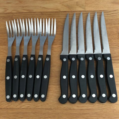 Set med 16 köksknivar med svart plasthandtag och metallblad. Knivarna har lika bladtyper, lämpliga för olika skäruppgifter i köket. Säljs för 100:-