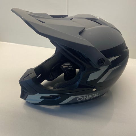 Två fullface cykelhjälmar, en vit/grå Scott i stl S och en blå Bell i stl S med skärm. Båda har justerbart hakspänne och flera ventilationshål.