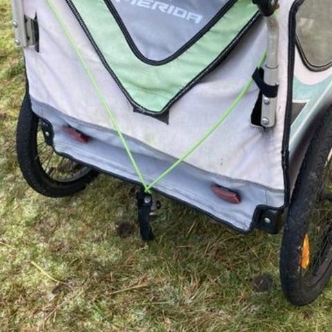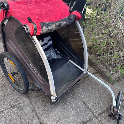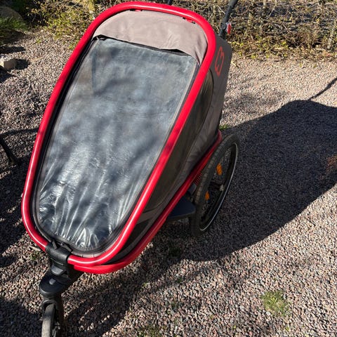 Röd och svart cykelvagn för barn med fönster på sidorna. Har sele inuti och rejäl metallram med stora bakhjul. Find fram jul och cykel fest. Bara upphämtning i Örebro.