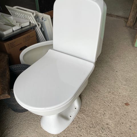 Vit toalettstol med mjukstängande sits och slät design. Har toppmonterad dubbelspolning med knapp och anslutning bakåt med flexibel slang.