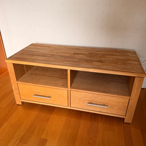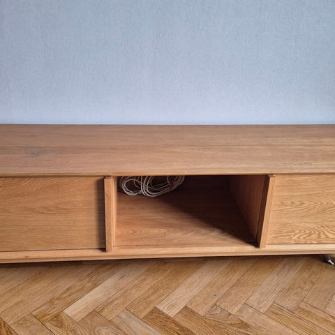 Mediamöbel ekfanér. Två skutskåp. Justerbart hyllplan i mitten.