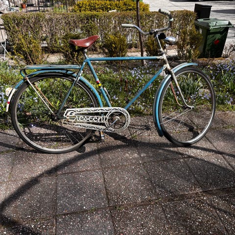 Orange Crescent herrcykel med 28" hjul och rak ram. Utrustad med pakethållare, skärmar, kedjeskydd och handbromsar fram och bak.