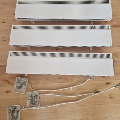 En LVI M-305 elradiator samt två LVI-508 elradiator vit färg. 380 V och effekt upp till 800 W. Avsedd för fast installation som elvärme i inomhusmiljö. Levereras med anslutningskabel och väggfästen enligt bilderna.