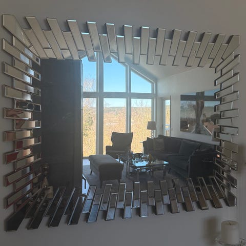 Säljer en stilren och modern väggspegel med dekorativa spegelpaneler i olika former. Perfekt som statement piece i vardagsrum, hall eller sovrum. Ger ett lyxigt och exklusivt intryck och reflekterar ljus på ett fint sätt.