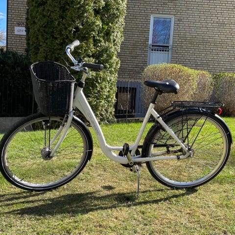 Crescent stadscykel med 28" hjul i unisexram M, med korg fram och pakethållare bak. Kedjeskydd och skärmar runt om samt fotstöd gör den smidig i vardagen.