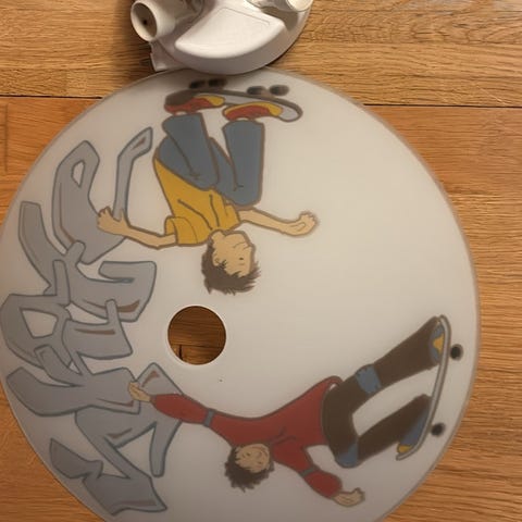Taklampa med takfäste säljes pga av flytt. Motivet är bilar.