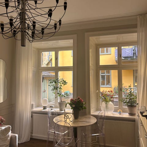 Krom fot och skiva i marmor. Jag har köpt det på blocket för två år sedan men knappt använt för det har varit till styling. Eftersom marmor är känsligt syns det vissa vita fläckar på ytskiktet i starkt ljus men det är ingenting man tänker på direkt. Nypris är ca 7000 på Mio.