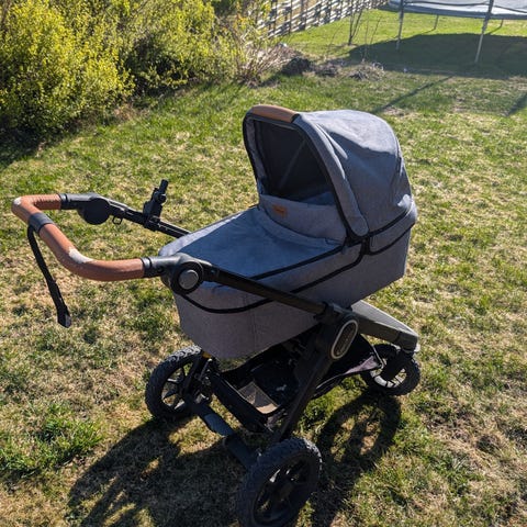 Emmaljunga NXT 90 outdoor med vändbar sittdel som går att lägga ner. svart med bruna detaljer på handtag och bygel. Har varukorg under, svängbara framhjul och justerbart handtag. Regnskydd samt snabbfäste för Britax babyskydd ingår. 1 ägare.