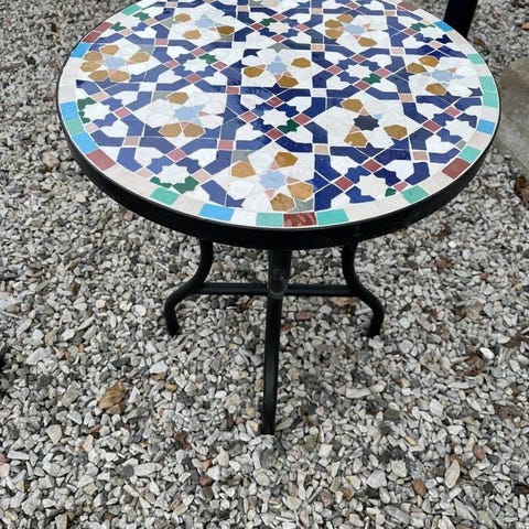 Ett tungt stabilt set med två stolar och ett bord. Mått på bordet är 60 cm i diameter och 71 cm högt. Bordet och stolarna är klädda med mosaik.