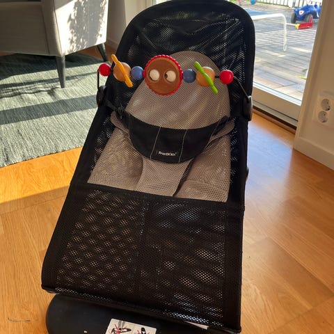 Svart babysitter från BabyBjörn med quiltad ovandel. Justerbar sele framtill och stadig metallram med fotplatta längst ner.