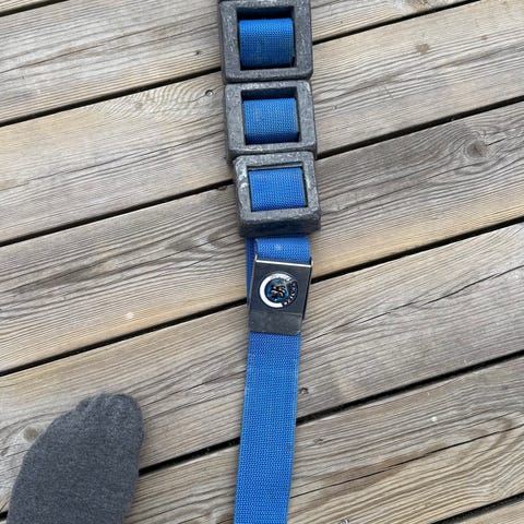 Viktbälte. 6 stycken vikter, totalt ungefär 10kg.