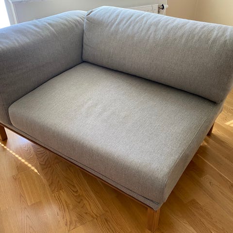 Grå hörnmodul och bäddsoffa. Lätt att montera och transportera. Blir en bädd inom 1 min.