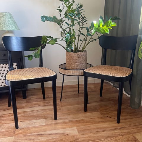 Rottingstolar från IKEA med armstöd och flätat mönster i ryggen. Matchande rund fotpall i rotting ingår, några av stolarna har sittdynor. Avhämtning i Eskilstuna.