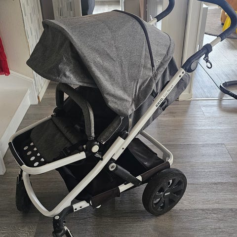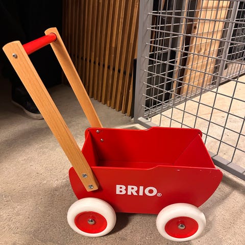 Svart lära-gå-vagn från Brio. Använt skick, lite repor, men ser annars fin ut.