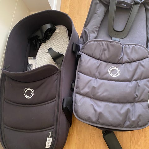 Bugaboo Bee3 liggdel i grått tyg med bärhandtag på sidorna. Dragkedja runt kanten och mjuk insida, samt fästen som syns på bilden.
