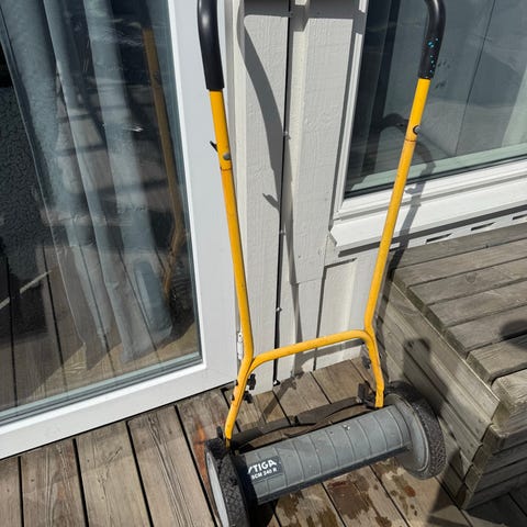 Gardena handgräsklippare 400 i blått med svart handtag. Lätt att rulla över gräsmattan och har stora hjul för bra grepp.